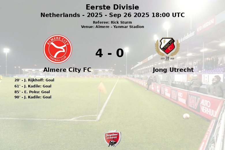 J. Rijkhoff abrió el marcador para el Almere City FC en el minuto 20 con un gol que desató la alegría en la afición local. En la segunda mitad, J. Kadile amplió la ventaja en el minuto 61, poniendo el 2-0 en el marcador. Si bien el Jong Utrecht intentó reaccionar, no logró inquietar la portería rival, acumulando cero tiros a puerta a lo largo del encuentro.