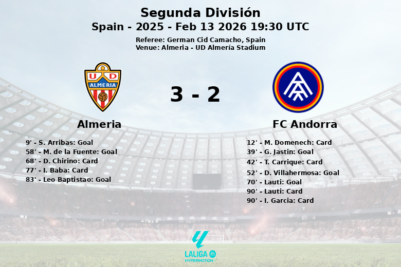 El Almería se adelantó temprano en el minuto 9 con un gol de S. Arribas, asistido por M. de la Fuente. Sin embargo, el FC Andorra reaccionó y G. Jastin empató el partido en el minuto 39, gracias a una asistencia de T. Carrique. La escuadra andorrana tomó la delantera en el minuto 52 con un gol de D. Villahermosa, en un ataque sin asistencia.