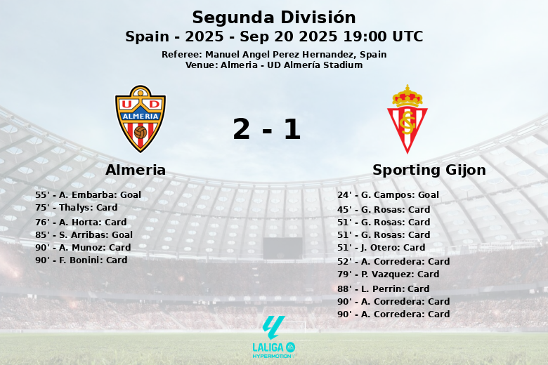 Almería, 20 de Septiembre de 2025 – En un encuentro disputado en el UD Almería Stadium, Almería logró una importante victoria sobre Sporting Gijón, aunque no sin antes pasar por momentos de tensión. El partido, correspondiente a la jornada 6 de la Segunda División, finalizó con un marcador de 2 a 1 a favor de los locales.
