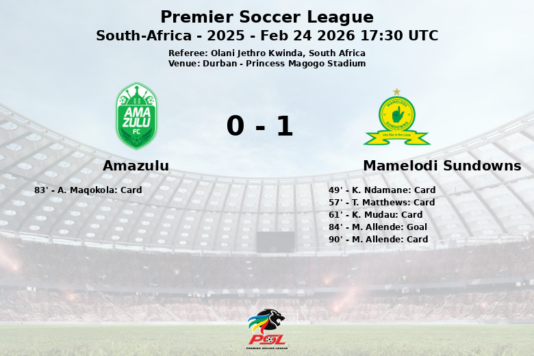 A pesar de esta diferencia en la posesión, el partido se mantuvo igualado hasta los últimos minutos. Amazulu intentó aprovechar sus oportunidades con 6 tiros, de los cuales 2 fueron a puerta, mientras que Mamelodi Sundowns generó un total de 28 tiros, aunque solo 5 lograron dirigirse al arco rival. La defensa de Amazulu, aunque superada en varias ocasiones, se mantuvo firme hasta el minuto 84, cuando M. Allende logró romper el empate con un gol que le dio la victoria a su equipo.