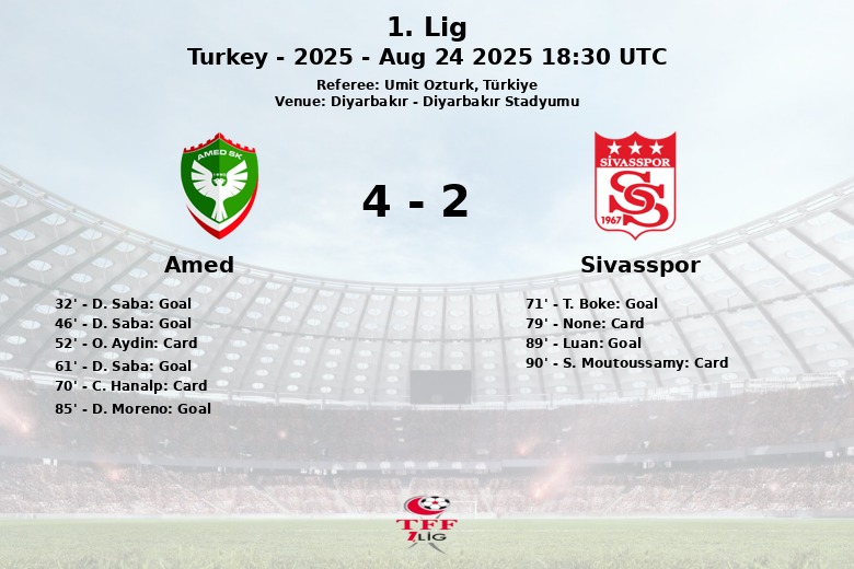 D. Saba fue la figura destacada del Amed, anotando un hat-trick (minutos 32, 46 y 61) que encarriló la victoria para su equipo. Su primer gol, con asistencia de S. Kurt, abrió el marcador. Le siguió otro tanto al inicio del segundo tiempo, esta vez asistido por C. Hanalp. El tercer gol de Saba consolidó la ventaja local.