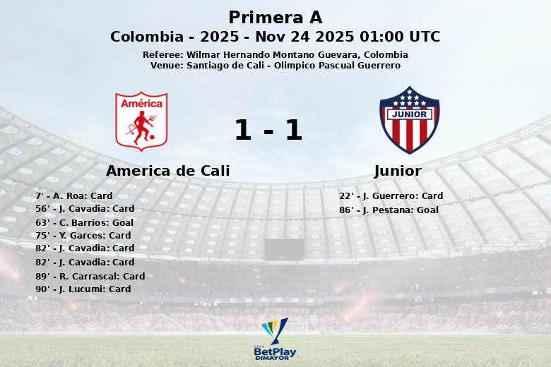 Santiago de Cali, Colombia – En un encuentro cargado de tensión y emociones en el Estadio Olímpico Pascual Guerrero, América de Cali y Junior de Barranquilla igualaron en un partido correspondiente a la fecha del Clausura de la Primera A colombiana. El árbitro Wilmar Hernando Montaño Guevara tuvo una noche ocupada, mostrando varias tarjetas.
