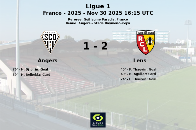 F. Thauvin fue la figura destacada del Lens, anotando dos goles. El primero llegó al minuto 45, asistido por O. Edouard, abriendo el marcador justo antes del descanso. Thauvin amplió la ventaja al minuto 74, esta vez con asistencia de S. Baidoo. Angers respondió con un gol de H. Djibirin al minuto 76, pero no fue suficiente para igualar el marcador.