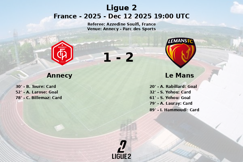 Le Mans se adelantó en el minuto 20 gracias a un gol de penal de A. Rabillard. Sin embargo, Annecy respondió en la segunda mitad con un gol de A. Larose en el minuto 52. La alegría local fue efímera, ya que S. Yohou del Le Mans anotó en el minuto 61, poniendo el 1-2 en el marcador.