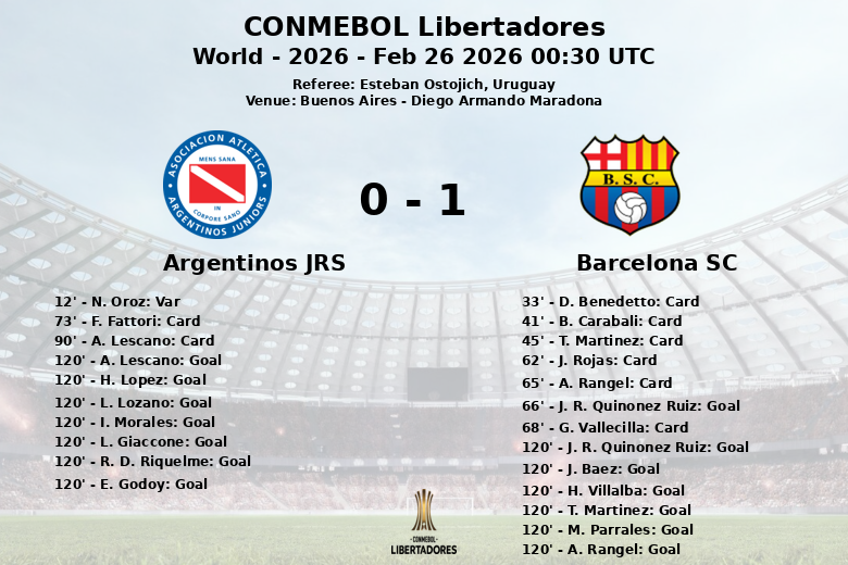 Buenos Aires – En un partido cargado de emociones y controversia, Argentinos Juniors y Barcelona SC empataron en un encuentro válido por la Ronda de Clasificación 2 de la CONMEBOL Libertadores 2026, disputado en el estadio Diego Armando Maradona. El equipo local dominó la posesión con un 70%, generando 10 disparos, de los cuales 7 fueron al arco, aunque uno fue anulado por el VAR a los 12 minutos por mano de N. Oroz. Barcelona SC, con un 30% de posesión, buscó defender y contraatacar, aunque generó solo 6 disparos, con 3 de ellos dirigidos al arco. El primer gol del partido llegó a los 66 minutos, obra de J. R. Quiñonez Ruiz para Barcelona SC, con asistencia de M. Celiz. El partido se definió desde el punto penal, con un empate agónico que culminó con una tanda de penales interminable donde los jugadores convirtieron 10 goles y fallaron otros 5. El árbitro uruguayo Esteban Ostojich mostró un total de 8 tarjetas amarillas, 2 para Argentinos Juniors y 6 para Barcelona SC, reflejando la intensidad y la fricción del juego.