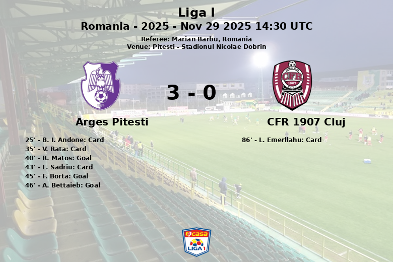 Pitesti, Romania – En un encuentro disputado en el Stadionul Nicolae Dobrin, el Arges Pitesti sorprendió al CFR 1907 Cluj con una victoria contundente. El partido, arbitrado por Marian Barbu, estuvo cargado de intensidad y emociones desde el principio.