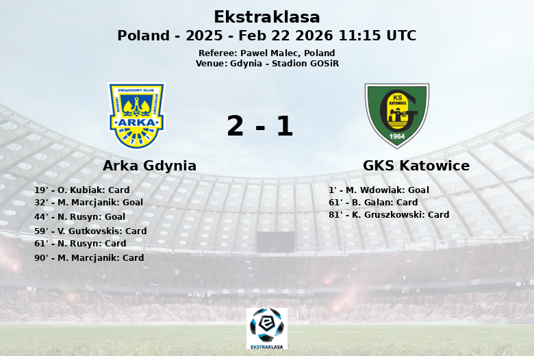 El encuentro comenzó con un gol tempranero del GKS Katowice al minuto 1, gracias a M. Wdowiak, asistido por B. Nowak. Sin embargo, el Arka Gdynia reaccionó y empató el partido al minuto 32 con un gol de M. Marcjanik. Antes del descanso, N. Rusyn amplió la ventaja para el Arka Gdynia al minuto 44, tras una asistencia de S. Kerk.