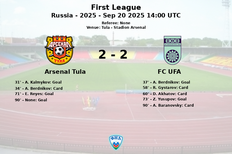 El Arsenal Tula abrió el marcador con un gol de A. Kalmykov en el minuto 31, tras fallar un penalti y aprovechar el rechace. Poco después, A. Berdnikov del Arsenal Tula recibió una tarjeta amarilla, presagiando una batalla física. El FC UFA respondió rápidamente gracias a un autogol desafortunado de A. Berdnikov en el minuto 37, igualando el marcador antes del descanso.
