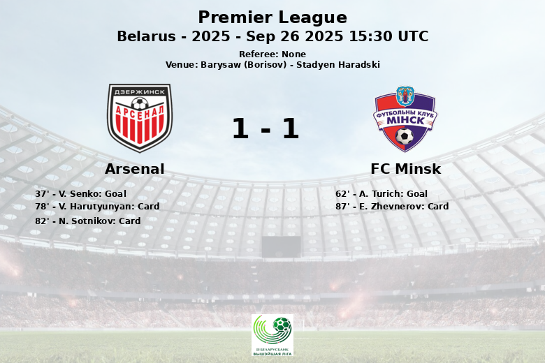 Barysaw (Borisov), Bielorrusia – En un encuentro correspondiente a la jornada 23 de la Premier League bielorrusa, Arsenal y FC Minsk igualaron 1-1 en el Stadyen Haradski. El partido, celebrado el 26 de septiembre de 2025, vio al Arsenal adelantarse en el minuto 37 gracias a un gol de V. Senko, asistido por M. Shchetinin. Sin embargo, el FC Minsk respondió en la segunda mitad, con un gol de A. Turich en el minuto 62. El encuentro, aunque con pocas ocasiones claras según las estadísticas (sin datos específicos sobre posesión, tiros, corners o faltas), se caracterizó por la intensidad y lucha en el mediocampo. La tarjeta amarilla mostrada a V. Harutyunyan (Arsenal) en el minuto 78, seguida por las tarjetas a N. Sotnikov (Arsenal) en el 82 y a E. Zhevnerov (FC Minsk) en el 87, dan fe de la competitividad del choque. Al final, el empate dejó sensaciones agridulces para ambos equipos en esta jornada de la temporada regular.