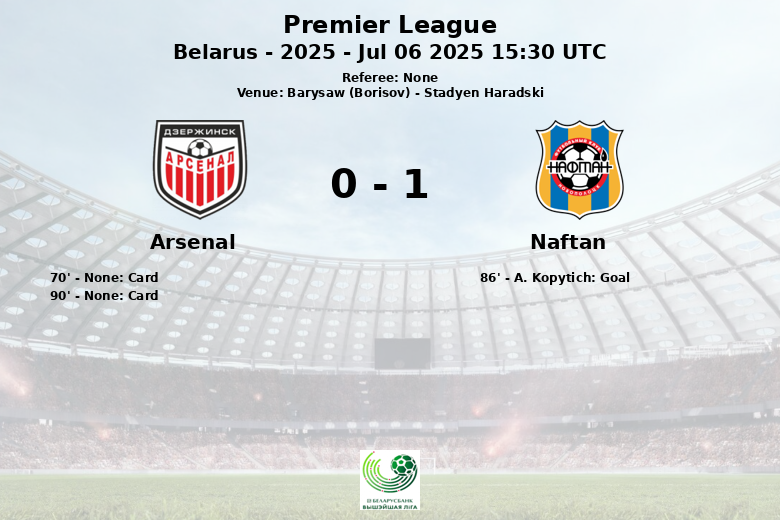 La emoción estalló en el minuto 86 cuando A. Kopytich del Naftan logró batir la portería rival, consiguiendo el único gol del partido. Este tanto crucial le dio la victoria al Naftan, dejando al Arsenal sin puntos en su visita a Barysaw. El Arsenal sumó dos tarjetas amarillas durante el encuentro.