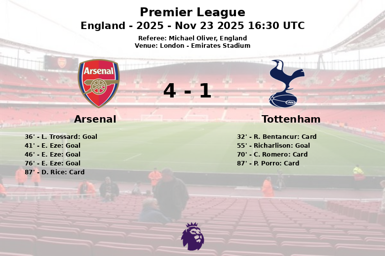 El Arsenal abrió el marcador al minuto 36 con un gol de Leandro Trossard, asistido por M. Merino. La ventaja se amplió rápidamente con un gol de E. Eze al minuto 41, asistido por D. Rice. Tras el descanso, Eze volvió a marcar al minuto 46, esta vez con asistencia de J. Timber. El Tottenham intentó reaccionar y Richarlison descontó al minuto 55, asistido por J. Palhinha. Sin embargo, Eze volvió a aparecer para sellar su triplete al minuto 76, asistido nuevamente por Trossard.