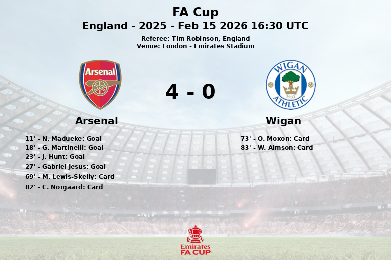 Londres, 15 de febrero de 2026 – El Arsenal demostró su superioridad en el Emirates Stadium, aplastando al Wigan en un partido correspondiente a la ronda de 32 de la FA Cup. El encuentro, disputado bajo la atenta mirada del árbitro Tim Robinson, terminó con una clara demostración de dominio por parte de los «Gunners».