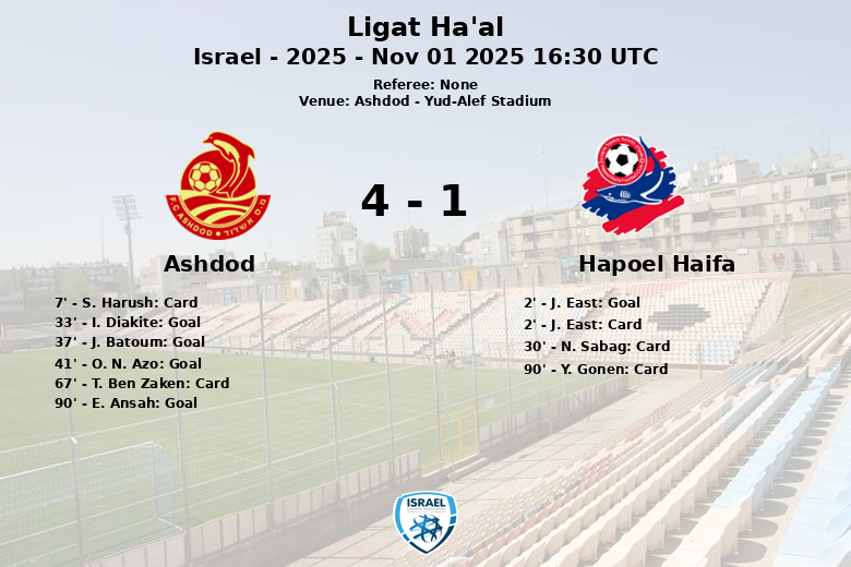 Ashdod, Israel – En un encuentro disputado en el Yud-Alef Stadium, el Ashdod se impuso con contundencia al Hapoel Haifa, en un partido correspondiente a la novena jornada de la Ligat Ha’al. El marcador final reflejó un dominio local, aunque el Hapoel Haifa inició el partido con fuerza.