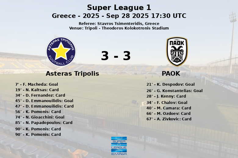 Tripoli, Grecia – En un partido cargado de emociones y tarjetas, el PAOK se impuso al Asteras Tripolis en el Estadio Theodoros Kolokotronis. El encuentro, válido por la quinta jornada de la Super League 1, Temporada 2025, dejó un total de siete goles y una gran cantidad de incidentes disciplinarios.