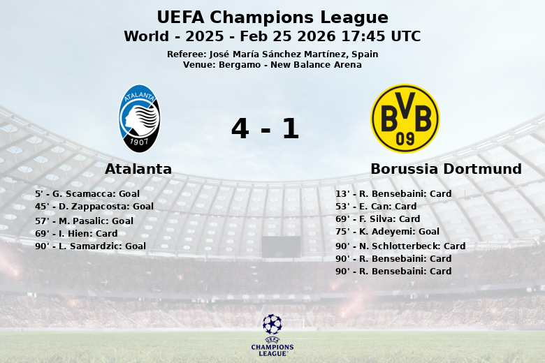 El partido se tornó aún más complicado para el Borussia Dortmund en los últimos minutos, con la expulsión de N. Schlotterbeck al minuto 90 y otra amonestación que resultó en la expulsión de R. Bensebaini al mismo minuto. El Atalanta selló su triunfo con un penal convertido por L. Samardzic en el tiempo de descuento, confirmando una noche redonda para el equipo de Bérgamo. El arbitro José María Sánchez Martínez estuvo a cargo del partido.