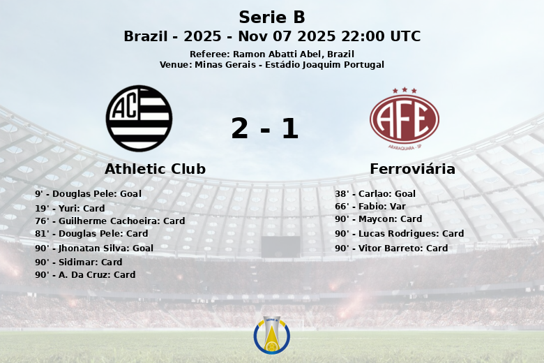 Minas Gerais, Brasil – En un encuentro vibrante y repleto de incidentes disputado en el Estádio Joaquim Portugal, el Athletic Club se impuso a la Ferroviária con un marcador de 2 a 1. El partido, válido por la jornada 36 de la Serie B brasileña, estuvo marcado por la intensidad y las múltiples tarjetas.