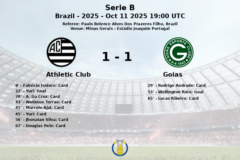Minas Gerais fue testigo de un encuentro reñido entre el Athletic Club y el Goiás, que finalizó en un empate con un gol para cada equipo. El partido, disputado en el Estádio Joaquim Portugal bajo el arbitraje de Paulo Belence Alves Dos Prazeres Filho, estuvo marcado por la intensidad y el elevado número de tarjetas amarillas.