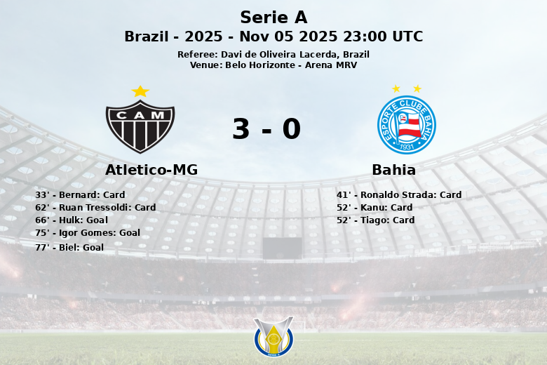 Belo Horizonte, 5 de noviembre de 2025 – El Atlético-MG se impuso con autoridad al Bahia en un partido disputado en la Arena MRV, correspondiente a la jornada 32 de la Serie A. El encuentro, arbitrado por Davi de Oliveira Lacerda, estuvo marcado por la superioridad del equipo local, que controló el balón con un 60% de posesión y generó un total de 23 disparos, 7 de ellos dirigidos a la portería.