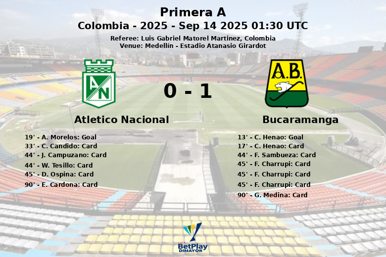Bucaramanga sorprendió al Atlético Nacional al minuto 13 con un gol de C. Henao, asistido por F. Sambueza. El gol tempranero dio la ventaja al visitante, pero la alegría duraría poco.