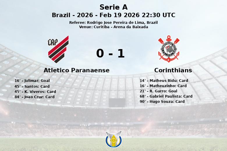 El Athletico Paranaense dominó la posesión del balón con un 56%, generando un total de 19 disparos, de los cuales 5 fueron dirigidos a puerta. Sin embargo, la falta de precisión y la buena defensa del Corinthians impidieron que se tradujeran en más goles. Julimar marcó para el Paranaense después de fallar un penal inicialmente. El Corinthians, por su parte, aprovechó una de sus pocas oportunidades y R. Garro igualó el marcador en el minuto 21.