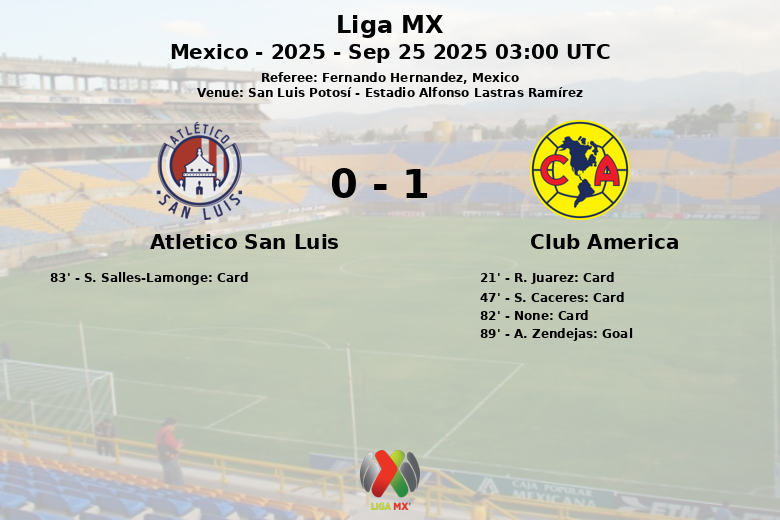 En un encuentro tenso y con pocas ocasiones claras, el Club América logró imponerse al Atlético San Luis con un gol agónico de Alejandro Zendejas al minuto 89, con asistencia de J. Zuniga. El partido, correspondiente a la jornada 10 del Apertura 2025 de la Liga MX, se jugó en el Estadio Alfonso Lastras Ramírez de San Luis Potosí, bajo el arbitraje de Fernando Hernández.