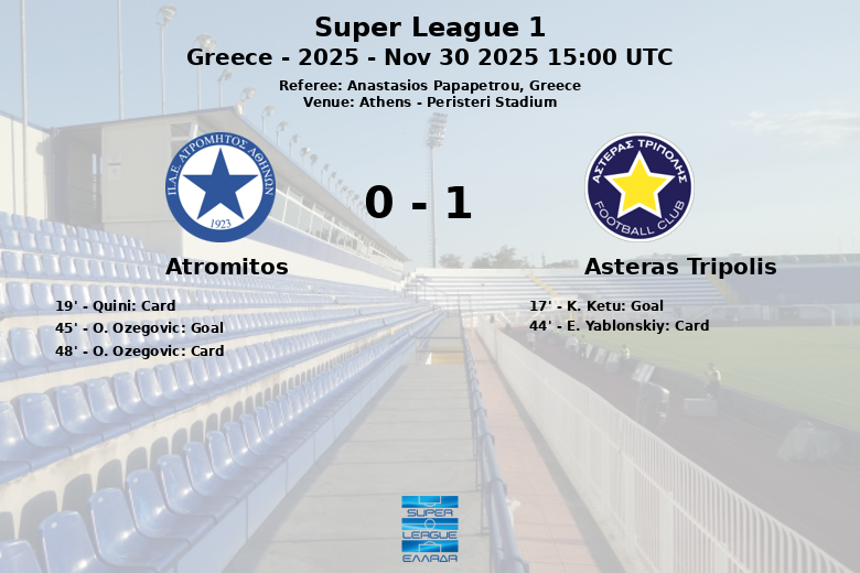 Asteras Tripolis golpeó primero en el minuto 17 con un gol de K. Ketu, asistido por F. Macheda, desatando la euforia entre sus seguidores. Sin embargo, Atromitos no se amilanó y, a pesar de dominar la posesión del balón con un 65%, tuvo que esperar hasta el minuto 45 para igualar el marcador. O. Ozegovic, tras fallar un penalti, aprovechó el rechace para marcar y poner el 1-1 antes del descanso.