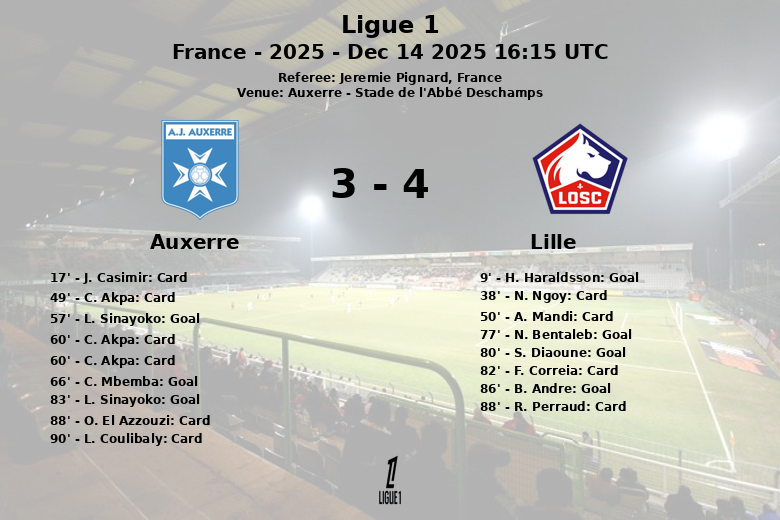 Los minutos finales fueron una locura, con una serie de tarjetas rojas que vieron a O. El Azzouzi del Auxerre y a R. Perraud del Lille expulsados al minuto 88. El partido terminó con un total de 13 tarjetas (5 amarillas y 2 rojas para el Auxerre, 2 amarillas y 2 rojas para el Lille). El Lille dominó la posesión con un 55%, mientras que el Auxerre tuvo más tiros (16 contra 7). El árbitro Jeremie Pignard tuvo una noche ocupada en este encuentro de la Ligue 1 correspondiente a la jornada 16.