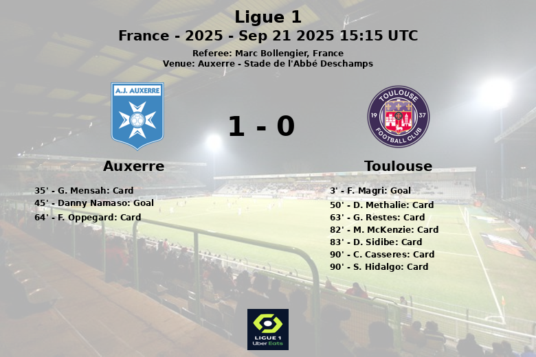 Auxerre, Francia – Un encuentro cargado de tensión y tarjetas fue el que protagonizaron Auxerre y Toulouse en el Stade de l’Abbé Deschamps. El partido, válido por la quinta jornada de la Ligue 1, finalizó en empate uno a uno. Toulouse se adelantó temprano, al minuto 3, con un gol de F. Magri tras fallar un penalti, el cual logro aprovechar en segunda instancia . Sin embargo, Auxerre respondió justo antes del descanso, al minuto 45, con un gol de Danny Namaso, asistido por L. Sinayoko.