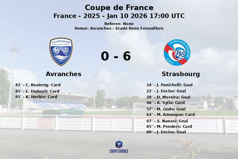 En un encuentro disputado en el Stade Rene Fenouillere de Avranches, el Strasbourg demostró su superioridad con una contundente victoria en la Copa de Francia. El partido, correspondiente a la ronda de 32, finalizó con un marcador abultado a favor de los visitantes.