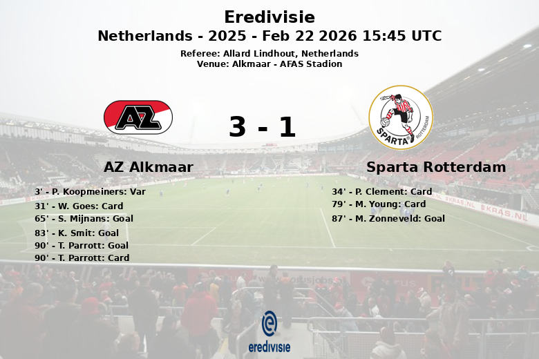 El AZ Alkmaar finalmente rompió el empate al minuto 65, gracias a un gol de S. Mijnans, asistido por M. Chavez Garcia. El equipo local amplió su ventaja en el minuto 83 con un tanto de K. Smit. Sin embargo, el Sparta Rotterdam respondió en el minuto 87 con un gol de M. Zonneveld, asistido por C. Terho, inyectando emoción en los minutos finales.
