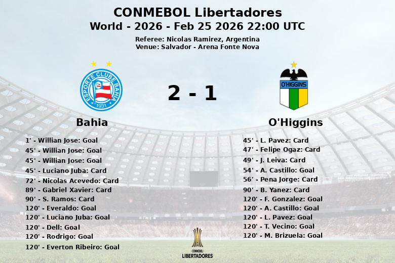 El partido comenzó con un gol tempranero de Willian Jose al minuto 1, asistido por Ademir, poniendo a Bahía en ventaja. La primera mitad culminó con una ráfaga de eventos: Willian Jose marcó nuevamente al minuto 45 tras fallar un penal, seguido de tarjetas amarillas para L. Pavez de O’Higgins y Luciano Juba de Bahía.