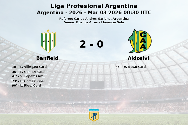 En un partido disputado en el Florencio Sola de Buenos Aires, Banfield se alzó con la victoria ante Aldosivi con un marcador de 2 a 0. El encuentro, válido por la fecha 8 de la Liga Profesional Argentina 2026, fue dirigido por Carlos Andres Gariano.
