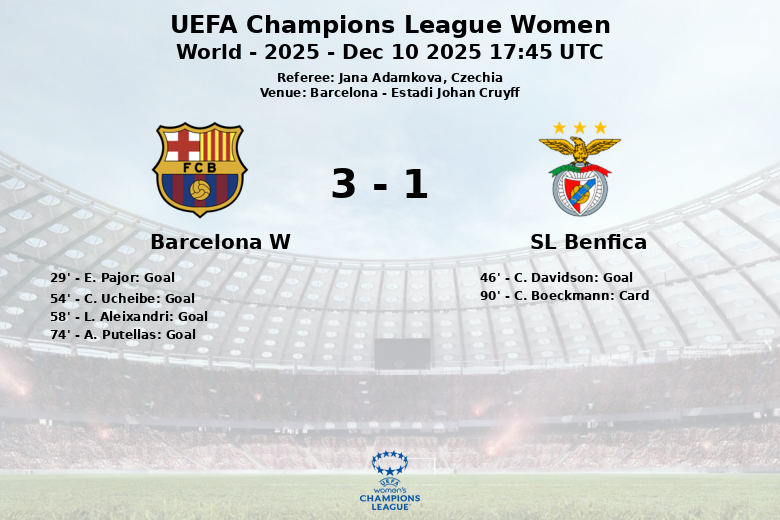 El marcador se abrió al minuto 29 con un gol de E. Pajor, asistida por A. Putellas. Sin embargo, el Benfica sorprendió al inicio del segundo tiempo con un tanto de C. Davidson al minuto 46, igualando momentáneamente el marcador. La alegría visitante fue efímera, ya que al minuto 54, un autogol de C. Ucheibe, tras una jugada de A. Putellas, devolvió la ventaja al Barcelona. Minutos después, al 58′, L. Aleixandri amplió la diferencia con un gol sin asistencia. A pesar de que A. Putellas erró un penalti al minuto 74, la superioridad del Barcelona fue evidente a lo largo del encuentro. El Benfica, con solo un remate a puerta y un 27% de posesión, no pudo contener el poderío ofensivo del equipo catalán. El encuentro finalizó con una tarjeta amarilla para C. Boeckmann del Benfica en el minuto 90.