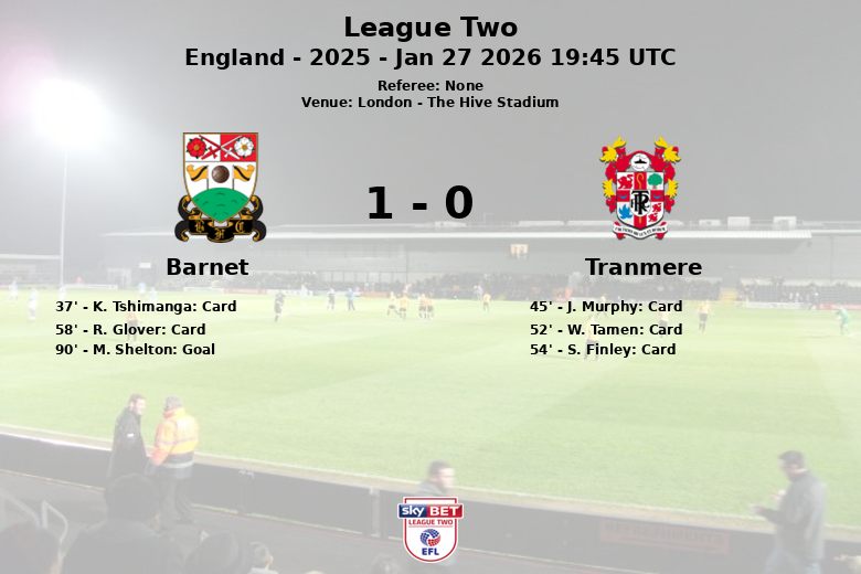 London, Inglaterra – En un partido disputado en The Hive Stadium, Barnet se impuso ante Tranmere en la jornada 29 de la League Two. Barnet dominó la posesión con un 63% frente al 37% de Tranmere, reflejando su control sobre el juego. Sin embargo, el marcador permaneció cerrado hasta los instantes finales. El partido se caracterizó por un juego físico, evidenciado por las cinco tarjetas amarillas mostradas a lo largo del encuentro, tres para Tranmere y dos para Barnet. Barnet generó un total de 20 disparos, con 6 dirigidos a portería, mientras que Tranmere solo logró 5 disparos, con 2 entre los tres palos. La insistencia ofensiva de Barnet finalmente se vio recompensada en el minuto 90 con un gol de M. Shelton, que selló la victoria para el equipo local. Tranmere, a pesar de su menor posesión, intentó aprovechar sus oportunidades, pero la defensa de Barnet se mantuvo firme. El partido concluyó con un triunfo agónico para Barnet, que suma tres puntos valiosos en su camino en la League Two.