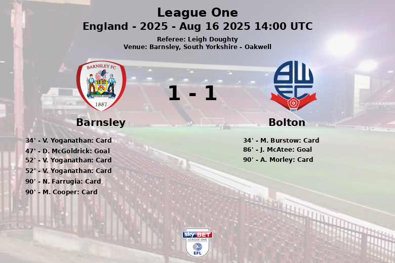 A pesar de jugar con diez hombres durante gran parte de la segunda mitad, Barnsley se defendió con uñas y dientes. No obstante, el Bolton, con mayor posesión (55%), logró empatar en el minuto 86 gracias a un gol de J. McAtee. El partido finalizó con un empate que dejó un sabor agridulce para ambos equipos, con un total de cinco tarjetas amarillas mostradas en los minutos finales del encuentro.