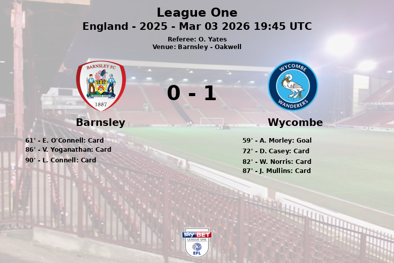 Barnsley, Inglaterra – Wycombe Wanderers se impuso como visitante ante Barnsley en un partido correspondiente a la jornada 26 de la League One disputado en Oakwell. El único tanto del encuentro llegó en el minuto 59, cuando A. Morley, asistido por L. Harris, mandó el balón al fondo de la red.