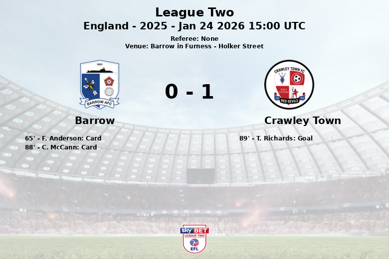 El partido también estuvo marcado por la intensidad, con un total de 15 faltas cometidas por Barrow, que recibieron dos tarjetas amarillas, en comparación con las 7 faltas de Crawley. Finalmente, Crawley Town se llevó los tres puntos en un encuentro reñido.