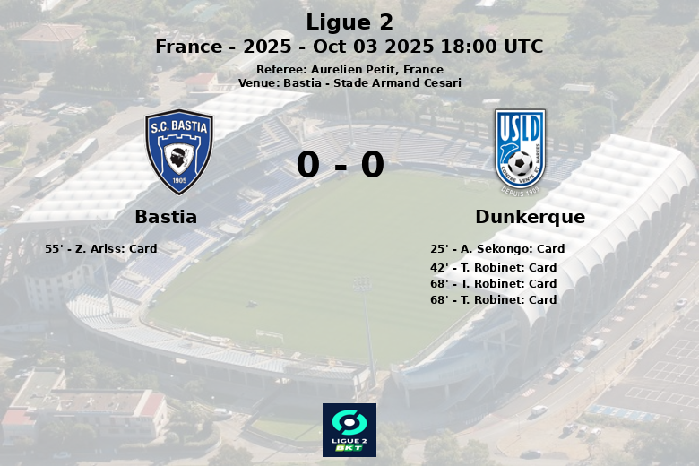 Por su parte, el Dunkerque se mantuvo firme en defensa, limitando las oportunidades del Bastia. A pesar de tener solo el 41% de la posesión, el Dunkerque intentó 5 disparos, ninguno de ellos con dirección a puerta. La intensidad del partido se reflejó en las tarjetas: el Dunkerque sufrió la expulsión de T. Robinet, además de otras dos tarjetas amarillas. El Bastia recibió una tarjeta amarilla. El árbitro, Aurelien Petit, tuvo una tarde ocupada en este encuentro correspondiente a la novena jornada de la Ligue 2.