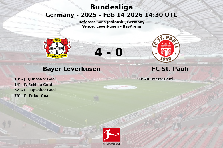 En la recta final del encuentro, E. Poku volvió a hacer vibrar las redes, esta vez asistido por J. Hofmann en el minuto 78, sellando la victoria para el Bayer Leverkusen. A pesar de los esfuerzos del FC St. Pauli, que intentó responder con algunos disparos desviados, no pudieron superar la solidez defensiva del equipo local. El partido finalizó con una tarjeta amarilla para K. Mets del FC St. Pauli en el minuto 90.