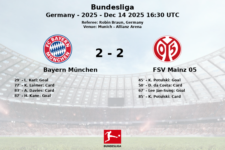 Múnich, Alemania – En un partido disputado en la Allianz Arena, el Bayern München y el FSV Mainz 05 empataron en un encuentro que mantuvo a los aficionados al borde de sus asientos hasta el último minuto. El partido, correspondiente a la jornada 14 de la Bundesliga, se jugó bajo el arbitraje de Robin Braun.