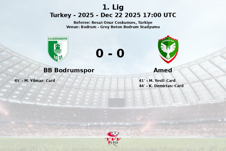 El encuentro fue marcado por la intensidad y las faltas, con 16 cometidas por el Amed y 9 por el BB Bodrumspor. El árbitro mostró 2 tarjetas amarillas al Amed y 1 al BB Bodrumspor. El partido finalizó sin goles, dejando a ambos equipos con un punto en la clasificación. Las tarjetas amarillas al final del primer tiempo para ambos equipos reflejaron la intensidad del medio campo.