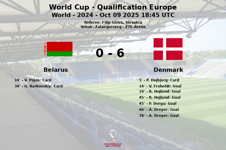 En resumen, un partido dominado de principio a fin por Dinamarca, que se lleva una victoria contundente en su camino hacia la clasificación para el Mundial. El árbitro eslovaco Filip Glova dirigió el encuentro en el marco de la fase de grupos de la Clasificación Europea para la Copa del Mundo.