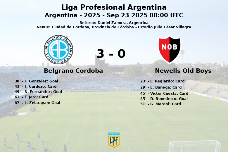 Ciudad de Córdoba, 23 de septiembre de 2025 – Belgrano Córdoba se impuso con autoridad a Newell’s Old Boys en el Estadio Julio César Villagra, en un encuentro correspondiente a la Liga Profesional Argentina. El partido, arbitrado por Daniel Zamora, estuvo marcado por una alta intensidad y varias incidencias disciplinarias.