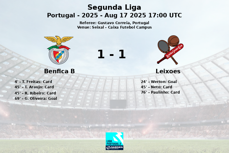 El Leixões se adelantó en el minuto 24 gracias a un gol de Werton, sin asistencia reportada. La primera mitad fue tensa, con varias tarjetas amarillas mostradas: T. Freitas (Benfica B) en el minuto 4, Neto (Leixões), T. Araujo y R. Ribeiro (ambos del Benfica B) todas justo antes del descanso.