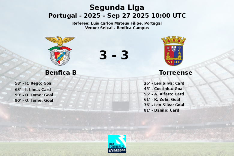 El Torreense se adelantó al filo del descanso con un gol de Costinha en el minuto 45, tras una asistencia de D. Jean. Sin embargo, el Benfica B respondió en el minuto 58 con un tanto de R. Rego. K. Zohi volvió a poner en ventaja al Torreense en el minuto 61. La alegría duró poco, ya que Leo Silva del Torreense amplió la ventaja en el 76′ con asistencia de J. Vazquez, pero un final dramático con dos goles de O. Tome en el minuto 90 rescató un punto para el Benfica B.