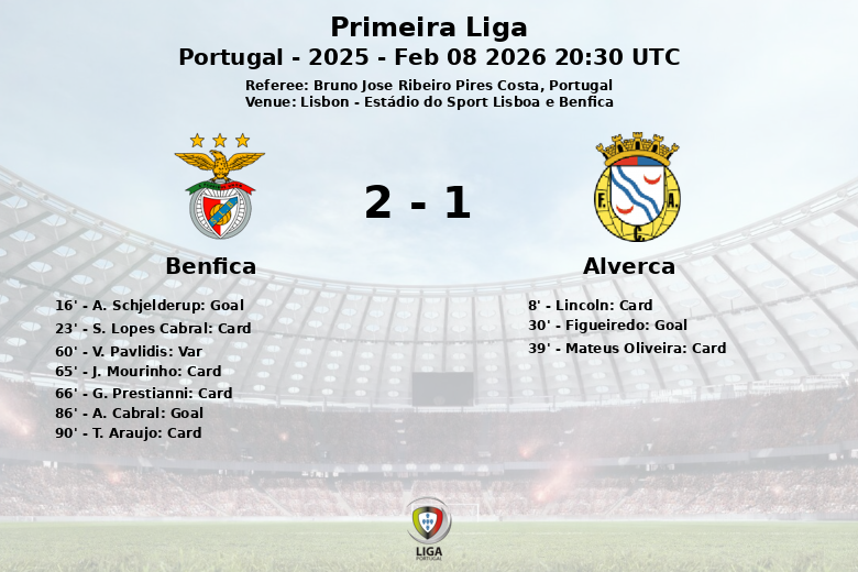 El Benfica, dominando la posesión con un 64%, abrió el marcador temprano, en el minuto 16, gracias a un gol de A. Schjelderup. Sin embargo, el Alverca demostró su garra y logró igualar el marcador en el minuto 30 con un tanto de Figueiredo.