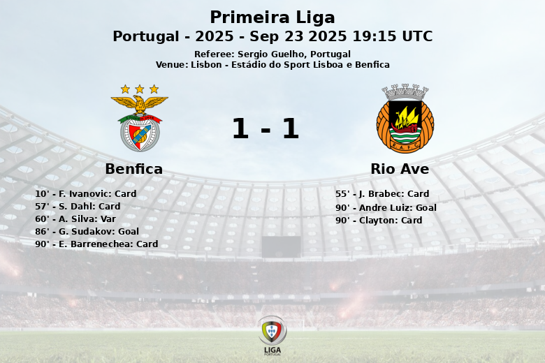 El partido estuvo marcado por un juego físico, evidenciado por las cuatro tarjetas amarillas mostradas a lo largo del encuentro. El VAR intervino en el minuto 60 anulando un gol a A. Silva del Benfica por una falta previa. El Benfica parecía tener el partido controlado cuando G. Sudakov anotó en el minuto 86, asistido por D. Lukebakio, sin embargo, Andre Luiz del Rio Ave respondió en el tiempo de descuento (90′) con un gol asistido por T. Nikitscher, igualando el marcador y sellando el empate final. El Rio Ave aprovechó al máximo sus limitadas oportunidades, mientras que el Benfica, a pesar de generar numerosas ocasiones, no logró concretar su superioridad en el marcador.