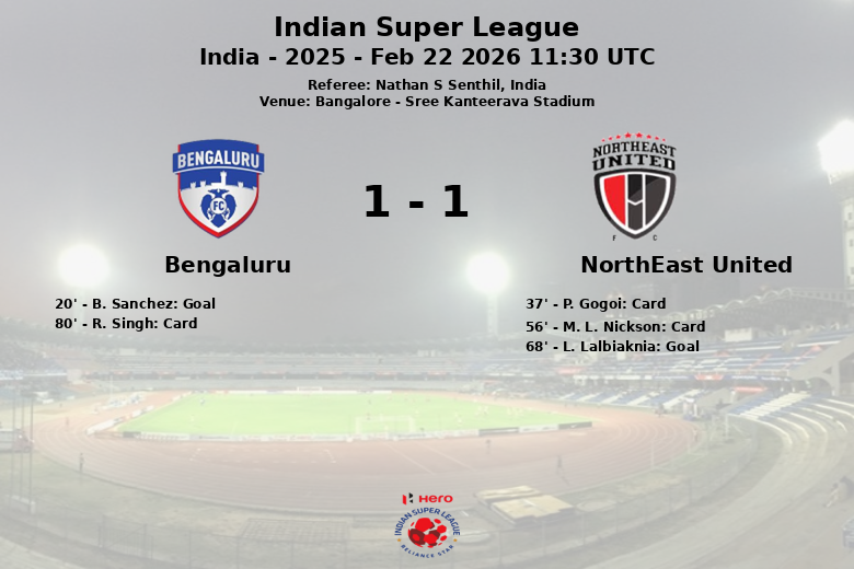 Bangalore, India – En un partido vibrante disputado en el Sree Kanteerava Stadium, Bengaluru FC y NorthEast United empataron en un encuentro que mantuvo a los aficionados al borde de sus asientos. Bengaluru tomó la delantera en el minuto 20 gracias a un gol de B. Sanchez, asistido por A. Kuruniyan. Sin embargo, NorthEast United luchó por volver al partido y finalmente encontró el empate en el minuto 68 a través de L. Lalbiaknia, con asistencia de A. Akhtar.