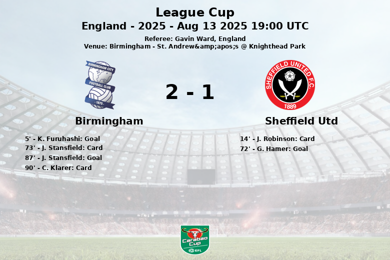En la segunda mitad, el Sheffield United logró igualar el marcador en el minuto 72 gracias a un gol de G. Hamer, asistido por S. Peck. Sin embargo, el Birmingham no se rindió y continuó presionando. J. Stansfield, quien también vio una tarjeta amarilla en el minuto 73, selló la victoria para el Birmingham en el minuto 87 con un gol crucial, asistido por W. T. Willumsson. C. Klarer del Birmingham recibió una tarjeta amarilla al minuto 90.