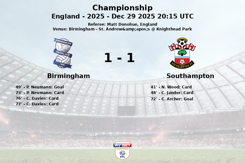 El encuentro fue tenso, evidenciado por las numerosas faltas (9 de Birmingham y 15 de Southampton) y las tarjetas amarillas. N. Wood y C. Jander vieron la tarjeta amarilla por el lado del Southampton, mientras que P. Neumann y C. Davies fueron amonestados por Birmingham, este último recibiendo doble amarilla. Birmingham generó 20 disparos, de los cuales 4 fueron a puerta, mientras que Southampton realizó 13 disparos con 5 a puerta. El partido finalizó con el marcador empatado, reflejando la paridad del juego.